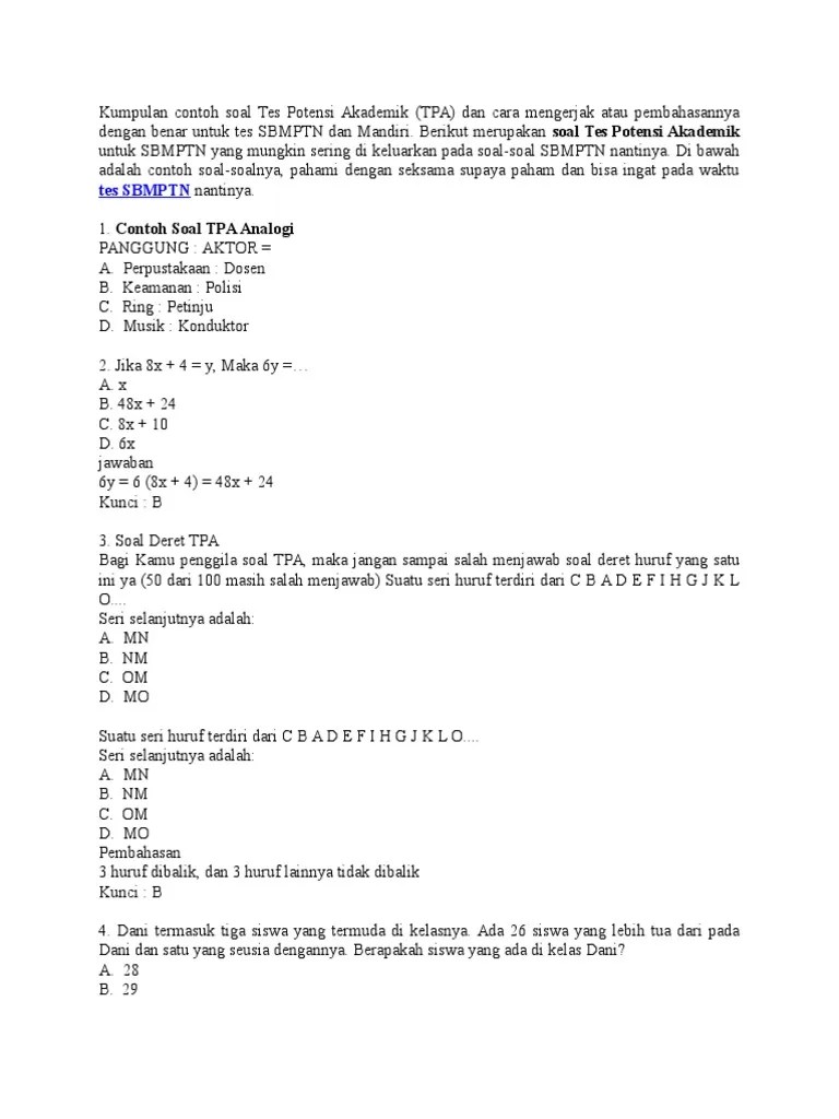 Untuk memudahkan anda dalam mengerjakan soal stip, khususnya untuk tpa atau tes kemampuan dan potensi akademik, bisa mengikuti contoh soal berikut:.